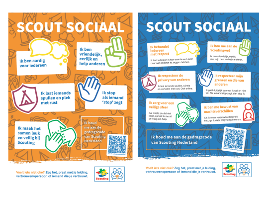 Om de gedragscode ook bij jeugdleden onder de aandacht te brengen, hebben we twee posters ontwikkeld. Een oranje poster specifiek voor de kleinste jeugdleden en de blauwe poster voor jeugdleden en volwassenen. Download de posters hieronder, print ze uit en hang ze op in de lokalen van jullie clubhuis en laat zien dat jullie staan voor een sociaal veilige Scoutinggroep!