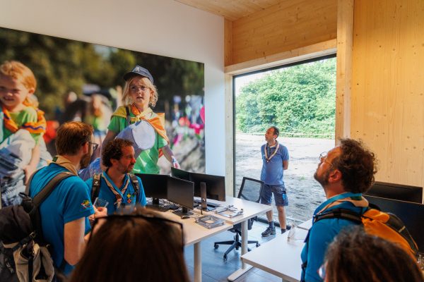Het openbare deel vind je aan aan de voorkant met een multifunctionele ruimte, vergaderruimtes en kantoren. Het is één lange gang, waarbij je ervaart dat hoe verder je doorloopt, hoe meer je in het ‘werkgebied’ komt. In de entree vindt je een expositie waar je stilstaat bij belangrijke onderdelen van Scouting, toen, nu en in de toekomst. Tegelijkertijd is de ruimte ook multifunctioneel te gebruiken. Een stand-up meeting, presentatie, noem maar op. Als je in de hoge ruimte omhoog kijkt zie je ook al verschillende Scoutingmemorabilia staan en hangen. Bijvoorbeeld de ligfiets die tijdens de World Scout Jamboree in Dronten in 1995 veel bekijks kreeg van internationale scouts. De open balie is multifunctioneel te gebruiken, niet alleen tijdens kantooruren, maar bv ook in een druk zomerseizoen of tijdens evenementen.